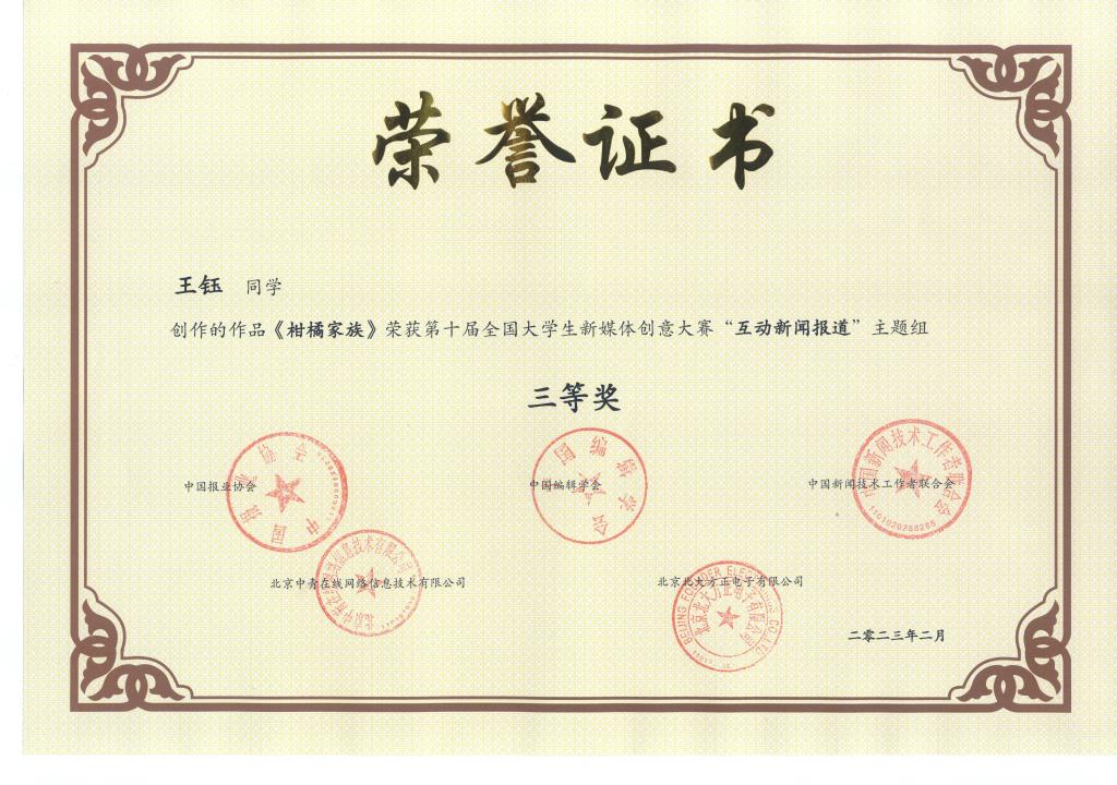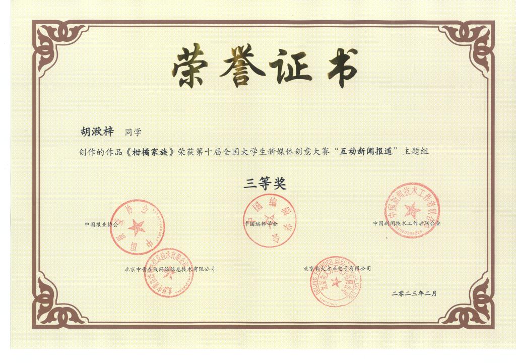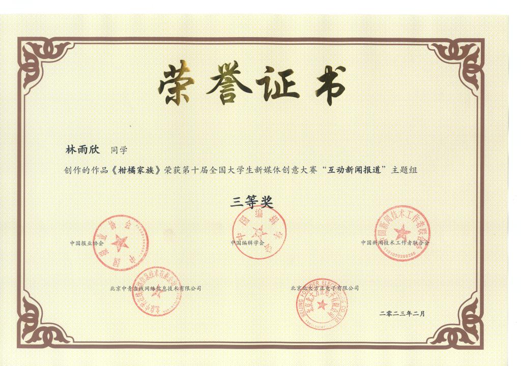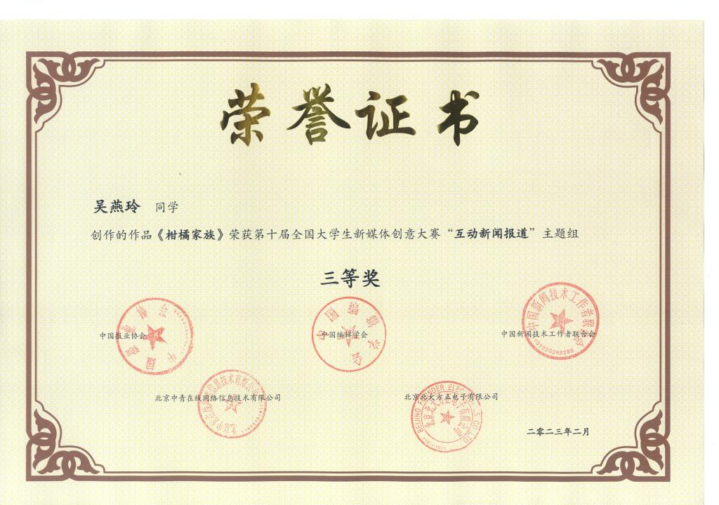 《柑橘家族》荣获第十届全国大学生新媒体创意大赛“互动新闻报道”主题组三等奖